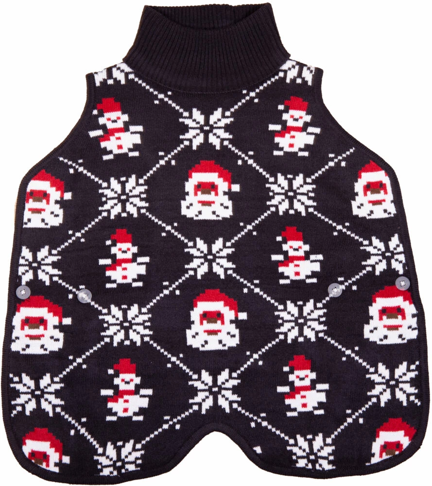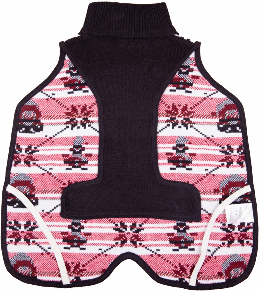 Komfortabel hundegenser med herlig julemotiv på ryggen og ribbestrikket mansjett rundt halsen. Genseren har mageklaff som festes til knapper på ryggen. Praktiske stropper rundt bakbena gjør at genseren sitter godt over ryggen. Kommer i to forskjellige størrelser, S og M, og passer til små og mellomstore hunder.