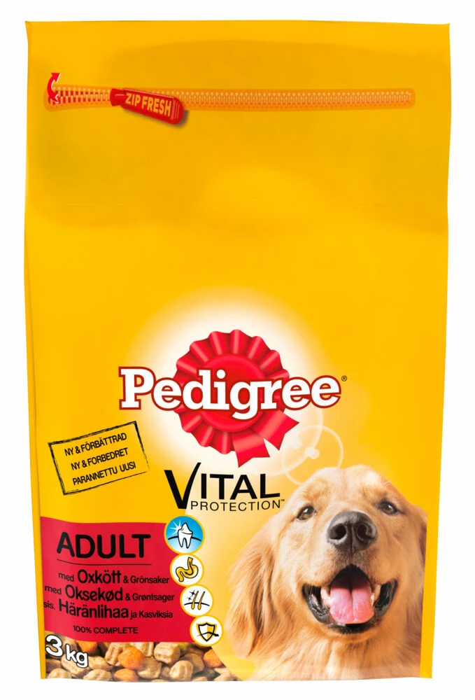 Pedigree® Adult er et sortiment med tørrfôr til hunder som vil passe perfekt for din hund. Det er 100% komplett, og laget uten kunstig smak, farge og sukker.