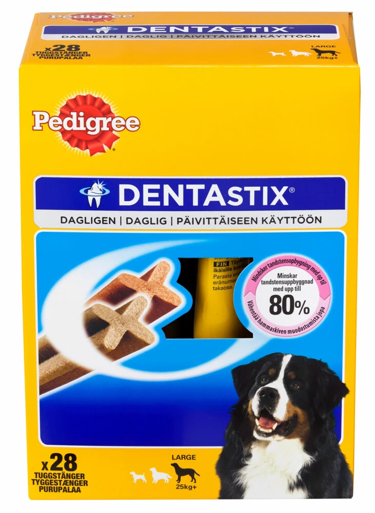 Pedigree® Dentastix® har en unik “X”-form og en spesiell slipende tekstur. Ved daglig bruk er det klinisk bevist at de bidrar til å redusere dannelse av tannstein med opp til 80 %.