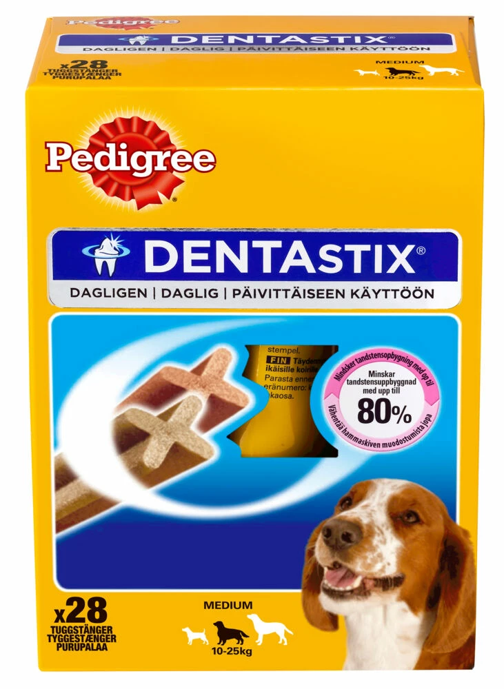 Pedigree® Dentastix® har en unik “X”-form og en spesiell slipende tekstur. Ved daglig bruk er det klinisk bevist at de bidrar til å redusere dannelse av tannstein med opp til 80 %.