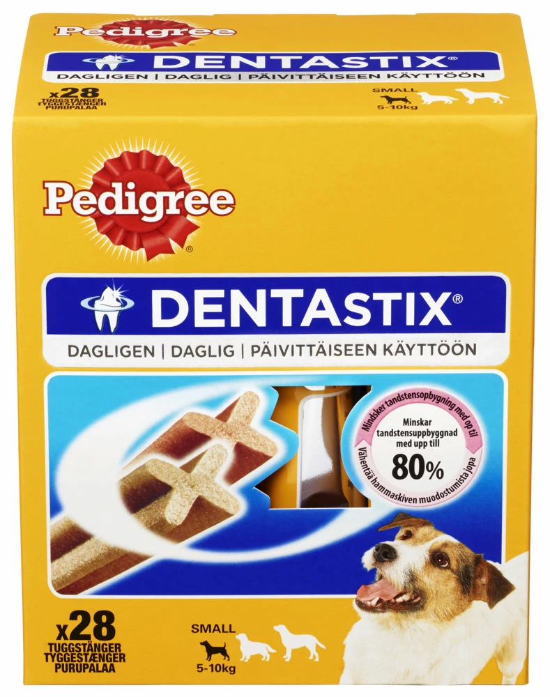 Pedigree® Dentastix® har en unik “X”-form og en spesiell slipende tekstur. Ved daglig bruk er det klinisk bevist at de bidrar til å redusere dannelse av tannstein med opp til 80 %. 8 av 10 hunder over 3 år har tannkjøttsykdom. Dette skyldes dannelse av plakk og tannstein rundt kanten av tannkjøttet. En rutine med daglig stell av munnhulen er den beste måten å redusere dette på.