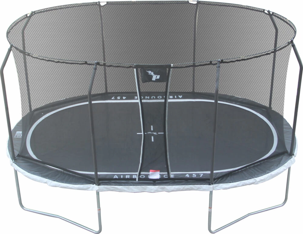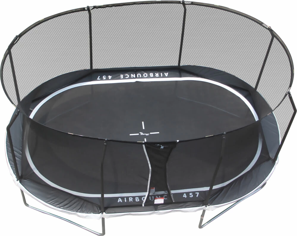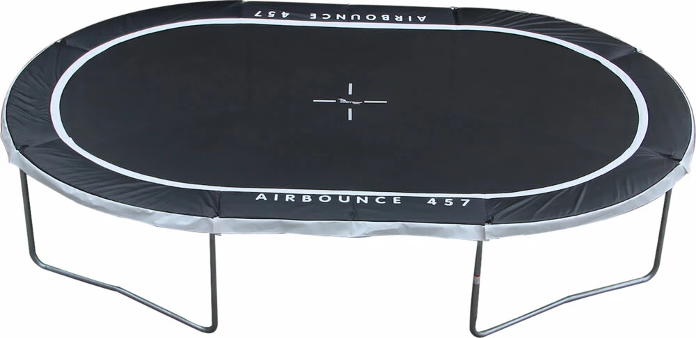 Oval trampoline med 8 ben og utvendig mål på 4,57 x 3,05 meter. Leveres komplett med sikkerhetsnett, polstring over fjærene og T-link systemet.